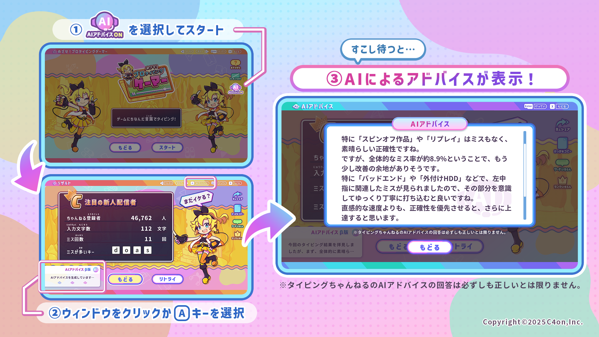 ※タイピングちゃんねるのAIアドバイス(β版)の回答は必ずしも正しいとは限りません。あくまでも参考情報としてのご利用にとどめておかれるようお願いいたします。