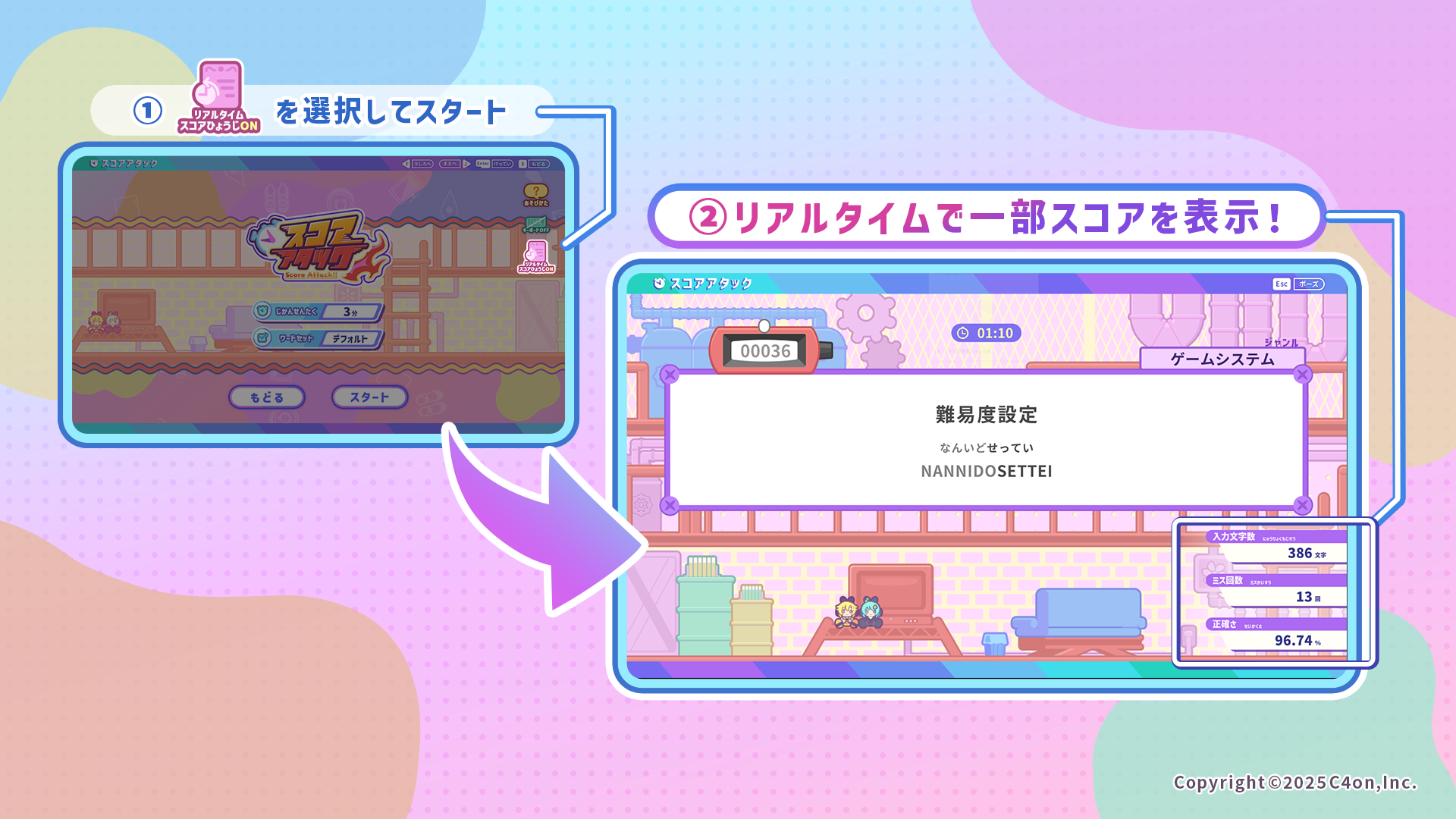 「スコアアタック」モードに、ゲームプレイ中に現在のスコアをリアルタイムで集計して表示する『リアルタイムスコアひょうじ』を追加しました。