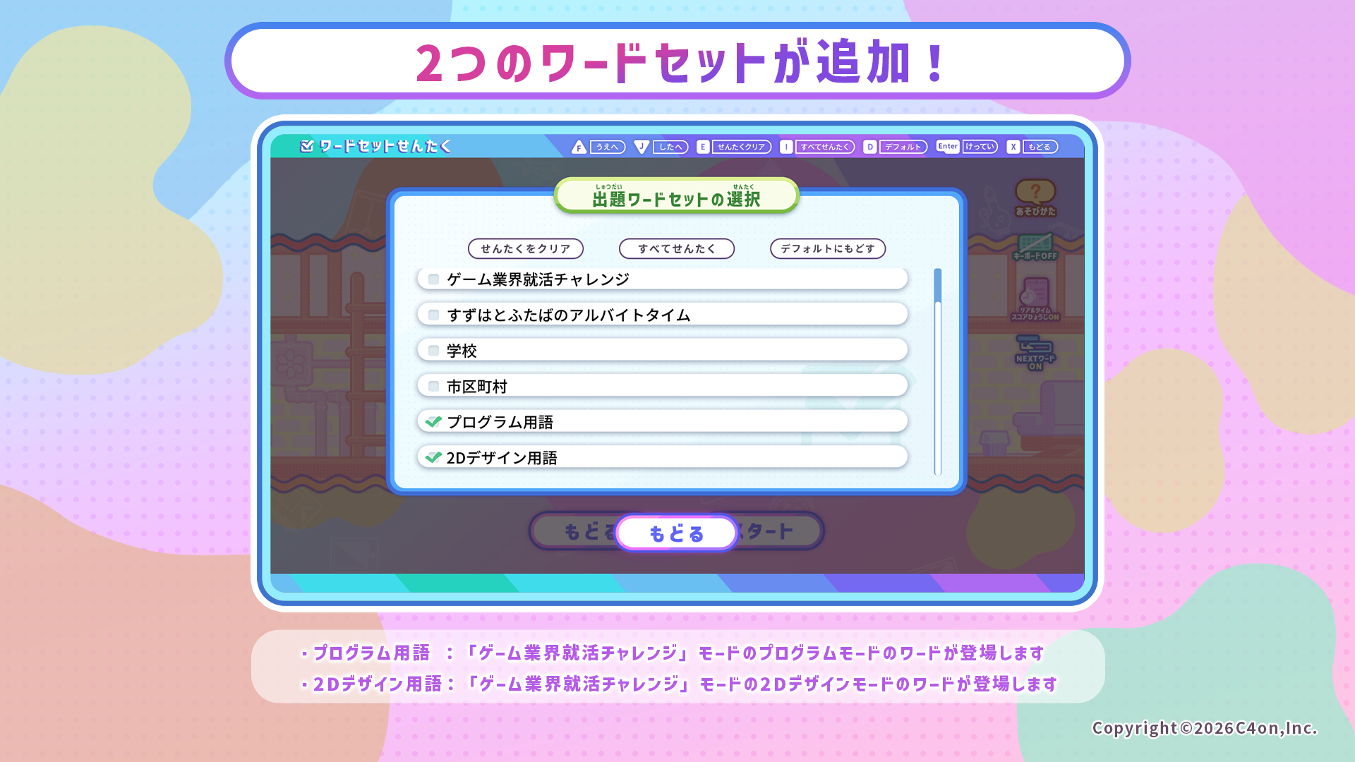 「ゲーム業界就活チャレンジ」モードの2Dデザインモードのワードが登場します